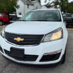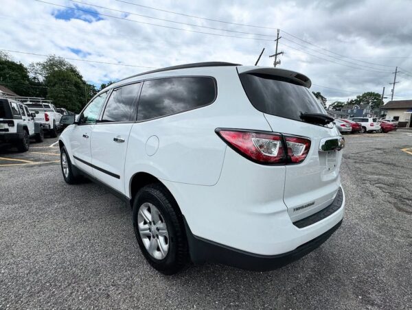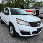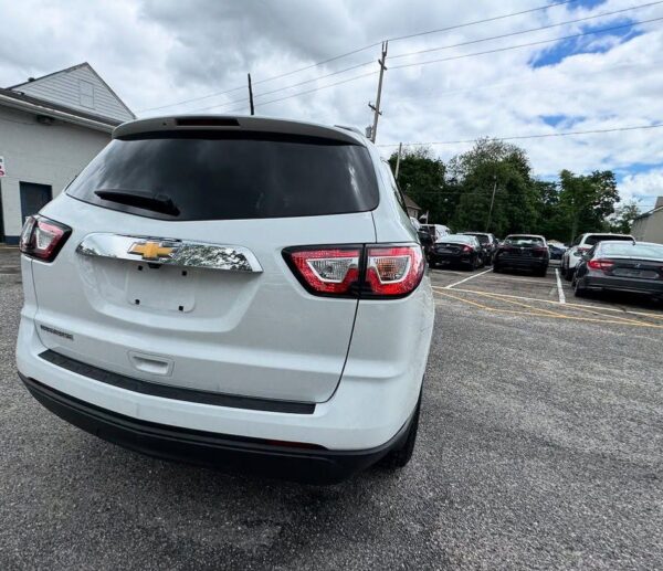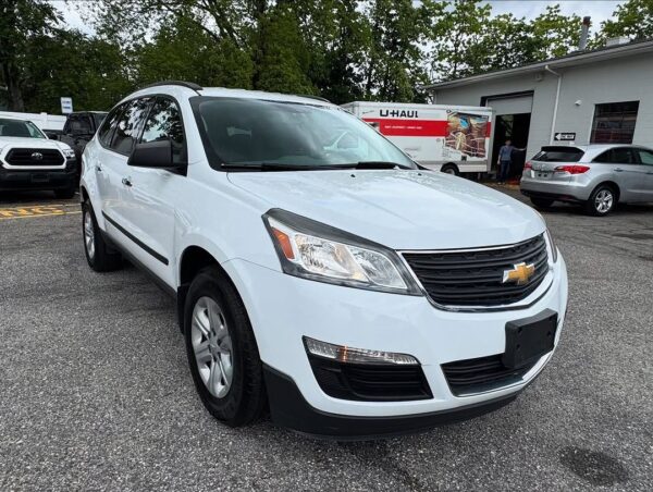 The 2017 Chevrolet Traverse LS is a three-row, front-wheel-drive or all-wheel-drive SUV that can seat up to eight passengers. It is powered by a 3.6-liter V6 engine, comes standard with a 6.5-inch touchscreen, a rearview camera, and SiriusXM satellite radio is available. Standard safety features include a high-strength steel safety cage and advanced airbags, while available features include blind-spot detection and rear cross-traffic alert.