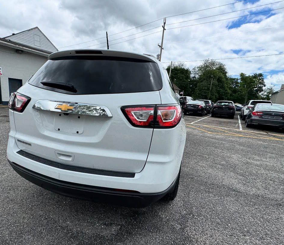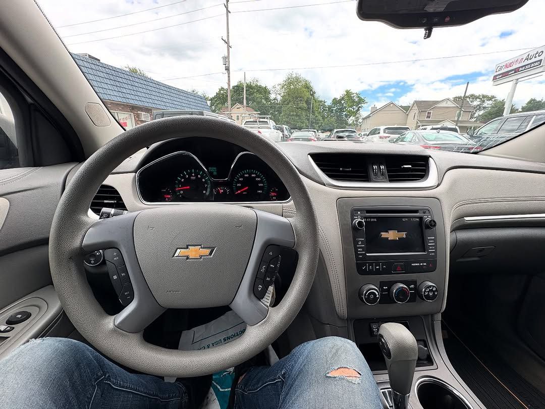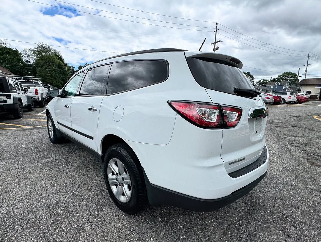 The 2017 Chevrolet Traverse LS is a three-row, front-wheel-drive or all-wheel-drive SUV that can seat up to eight passengers. It is powered by a 3.6-liter V6 engine, comes standard with a 6.5-inch touchscreen, a rearview camera, and SiriusXM satellite radio is available. Standard safety features include a high-strength steel safety cage and advanced airbags, while available features include blind-spot detection and rear cross-traffic alert.